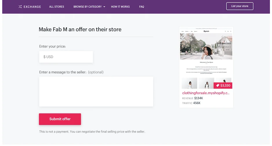 Grâce à l'application Exchange, qui extrait des informations telles que les données de trafic et de revenus directement de Shopify, les commerçants peuvent répertorier leur activité de commerce électronique à vendre. Les vendeurs ne peuvent pas modifier les données de leur magasin, ce qui signifie que si vous souhaitez acheter une entreprise de commerce électronique, vous pouvez vous sentir en sécurité en sachant que ce que vous voyez est ce que vous obtenez.