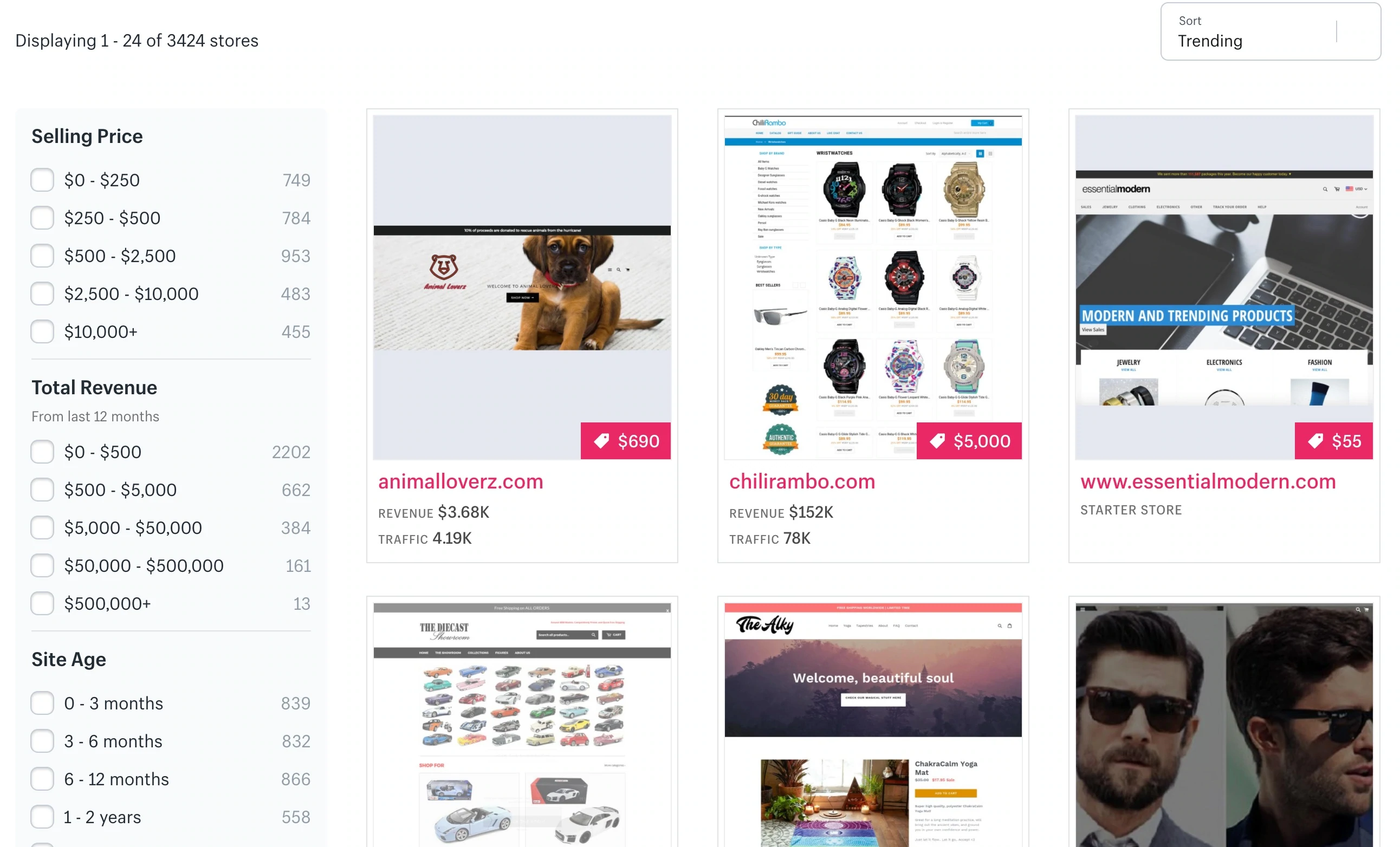 Les magasins Starter sont déjà construits et prêts pour la commercialisation, mais ont réalisé moins de 100 USD de ventes (les données sur le trafic et les revenus n'apparaîtront pas pour eux). Par conséquent, ces magasins se vendent souvent beaucoup moins cher et doivent être évalués en fonction du potentiel que vous voyez dans le magasin et si vous pensez pouvoir le débloquer grâce au marketing.