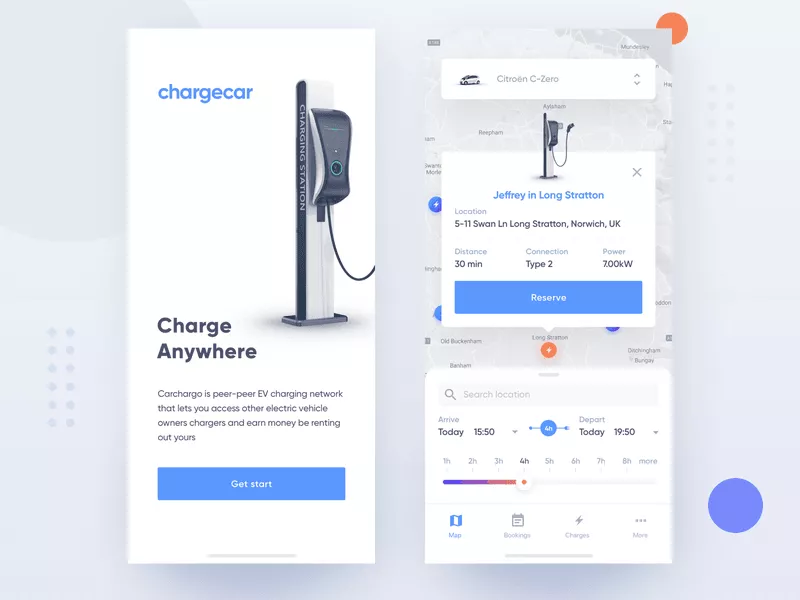 La navigation dans l'application via GPS et l'utilisation d'une API cartographique telle que Google Maps permettront à l'utilisateur de trouver des stations de recharge en temps réel sur la carte. Les utilisateurs peuvent également obtenir des indications pour se rendre au point de charge via l'application.