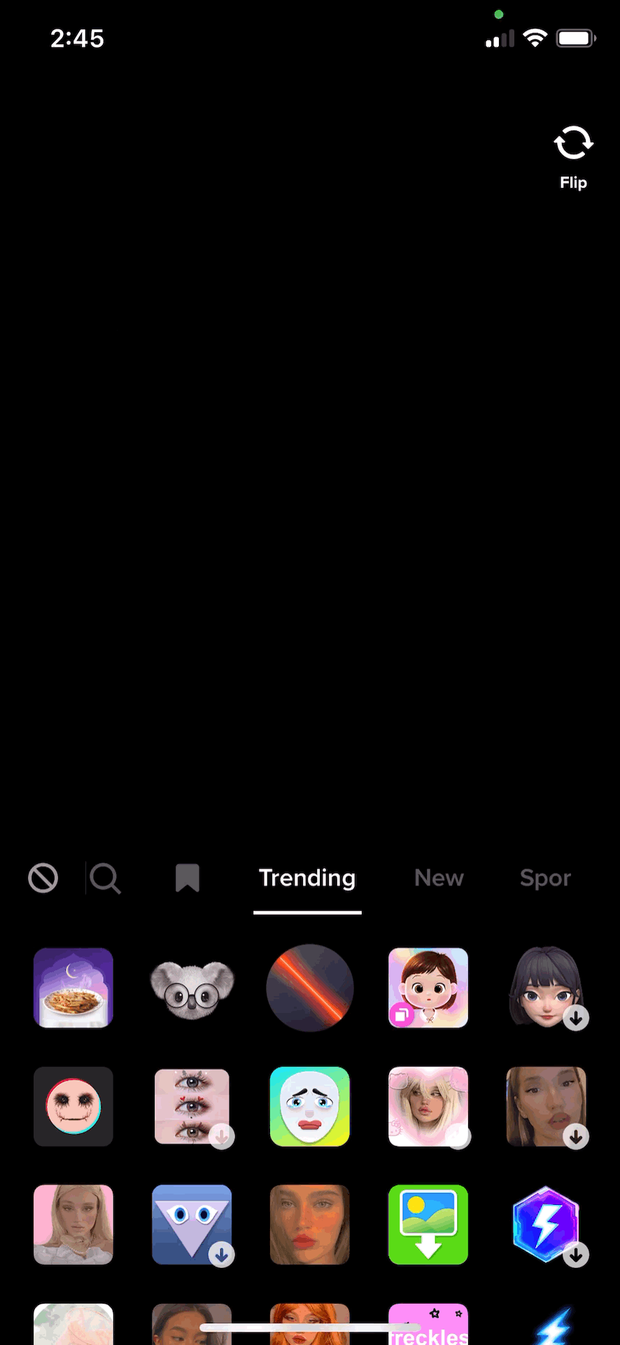 - Effets d'écran d'enregistrement : Ces effets se trouvent sur votre écran d'enregistrement et peuvent être utilisés pour filmer votre TikTok à l'aide de l'application. Vous avez le choix entre des centaines d'effets : effets de tendance, effets d'ambiance, filtres AR, filtres de beauté, effets d'écran vert, effets interactifs comme des quiz et bien plus encore.