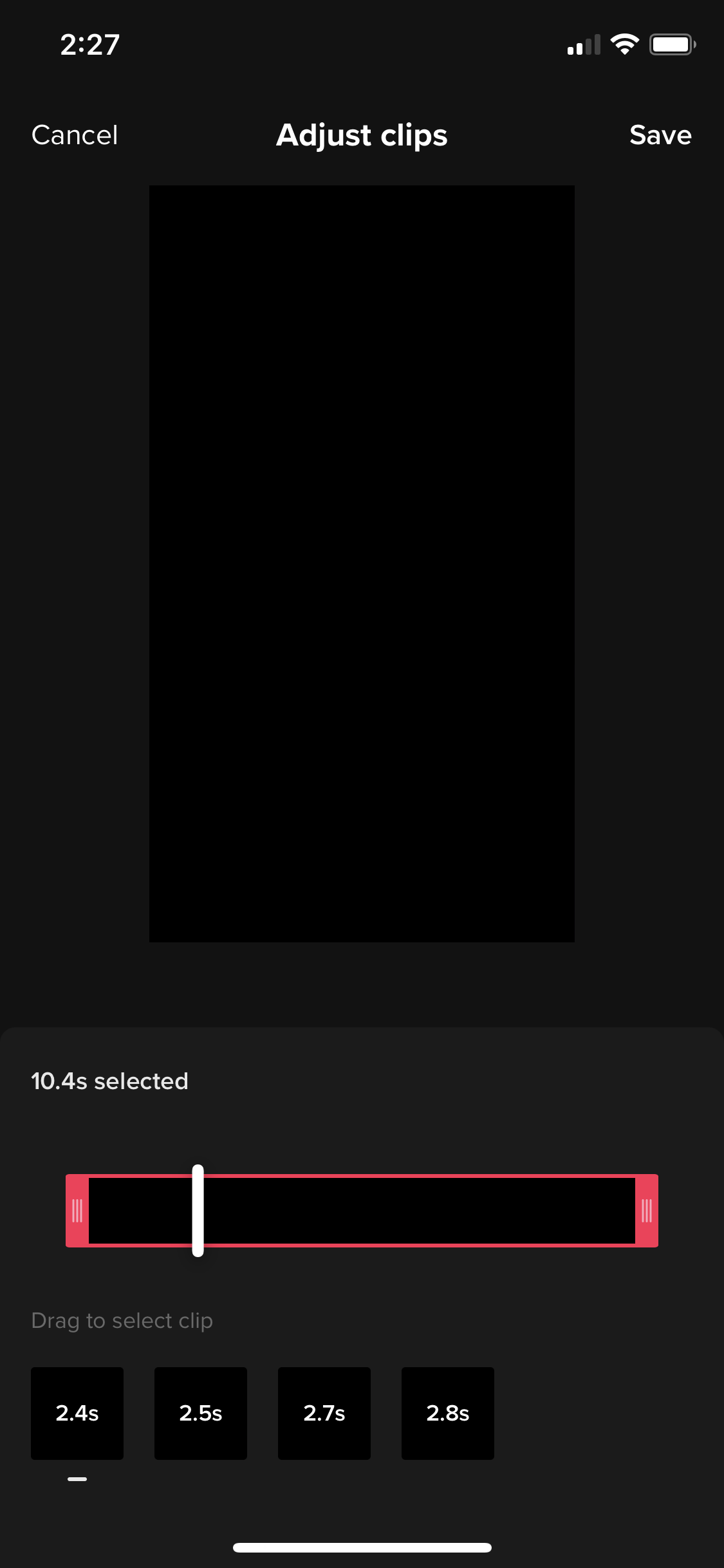 - Téléchargez un clip préenregistré à partir de votre pellicule ou enregistrez une vidéo nouvellement enregistrée sur votre téléphone, puis téléchargez-la à nouveau. Appuyez sur Ajuster les clips et sélectionnez l'icône du minuteur pour régler la vitesse. Vous pouvez choisir parmi les cinq mêmes options énumérées ci-dessus.