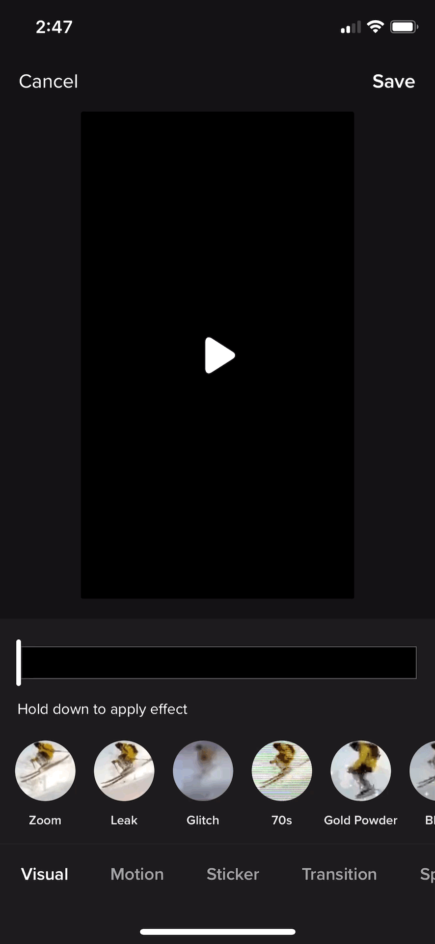 - Modification des effets d'écran : il s'agit d'effets que vous pouvez appliquer à des vidéos préenregistrées et qui sont différents des effets d'écran d'enregistrement. Vous pouvez les trouver sur l'écran d'édition en appuyant sur Effets. Ceux-ci incluent des effets visuels tels que Rainbow Strobe, Rain, Flash, Zoom et Glitch, ainsi que des effets de mouvement, des autocollants, des transitions, des effets de fractionnement et de temps.