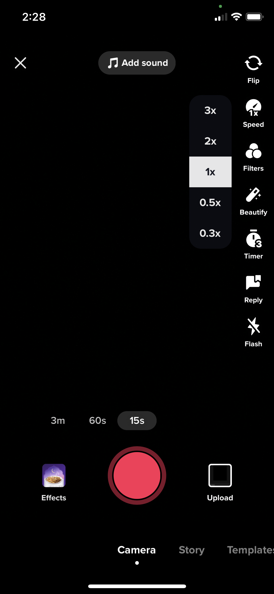 TikTok vous offre cinq options pour ralentir votre vidéo, la garder normale ou l'accélérer ; 0,3x, 0,5x, 1x, 2x et 3x.