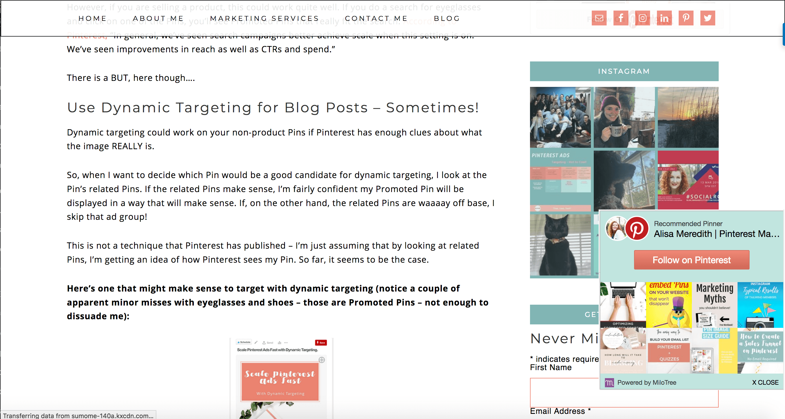 Pendant un certain temps, j'ai épinglé publiquement de nombreuses recettes et entraînements et j'ai attiré des abonnés intéressés par ces sujets et non intéressés par mes épingles marketing. Ainsi, lorsque Pinterest partage mes épingles avec mes abonnés, le manque d'engagement envoie à Pinterest un signal indiquant que mon contenu ne résonne pas. Pas bon.