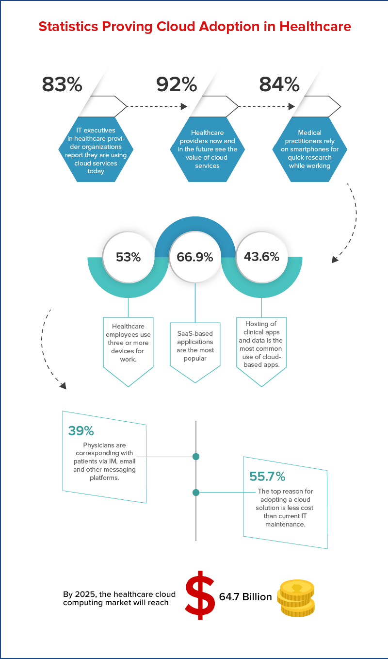 Les solutions de cloud computing – hybrides, publiques ou privées – offrent un niveau de services similaire à celui des organisations informatiques internes mais à des coûts très bas. Parallèlement à la réduction des coûts d'exploitation, l'amélioration de la qualité des soins incite également les prestataires de soins à adopter le cloud sous une forme ou une autre.