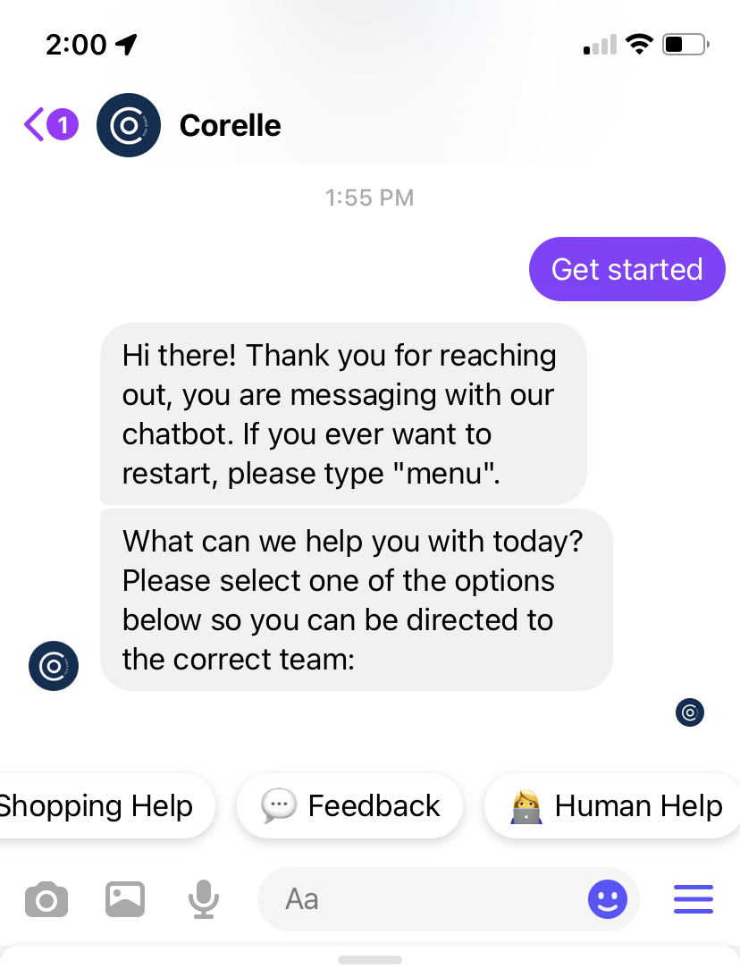 Si vous regardez le chatbot Facebook Messenger de Corelle, vous verrez que la possibilité de demander de l'aide humaine est toujours disponible. Cependant, si un client manque de temps et peut résoudre son problème grâce à des outils en libre-service, il est habilité à le faire.