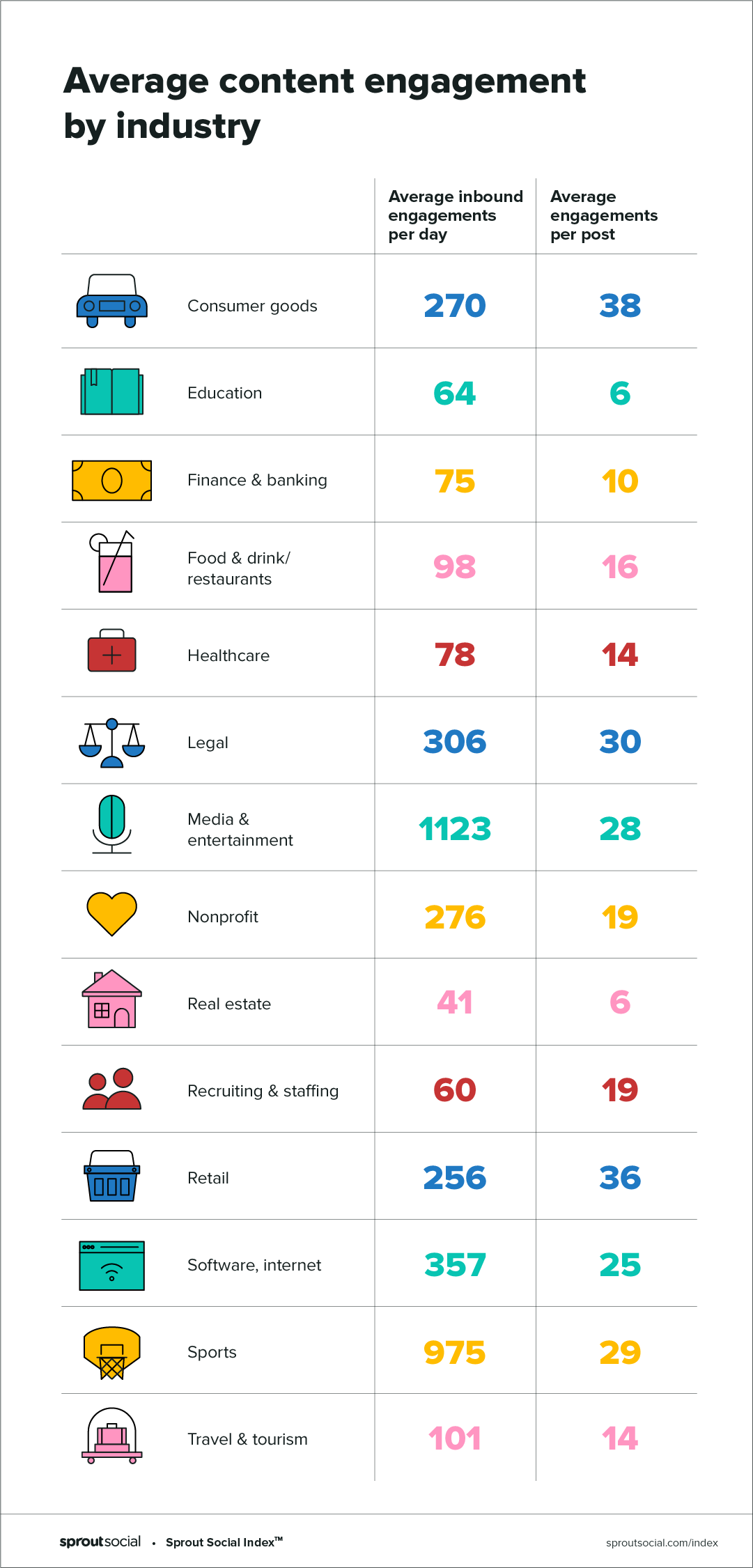 Avis de non-responsabilité : les données de Sprout Social incluent des utilisateurs de différents types de forfaits, secteurs et emplacements. Les données de cet article ont été extraites sur la base des performances des médias sociaux pour 2019. Pour voir comment les interactions des médias sociaux avec les marques ont changé depuis que COVID-19 a considérablement perturbé le comportement des consommateurs et des entreprises en 2020, lisez notre étude récente sur les changements post-COVID qui couvre la meilleure façon les heures de publication et les repères de cet article ont changé en conséquence.