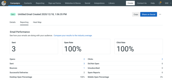 Si vous utilisez Constant Contact, après avoir envoyé votre e-mail, vous pouvez voir les détails du rapport dans votre compte Constant Contact sous les onglets Campagnes et Rapports.