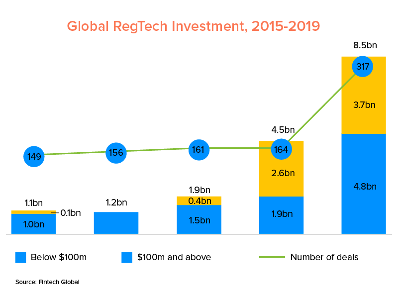 Rendre cette expansion possible sont les investisseurs qui soutiennent le domaine RegTech. 2015 a commencé avec 149 accords RegTech qui ont totalisé 1,1 $. Valorisation en milliards. Le nombre est ensuite passé à 317 transactions qui s'élevaient à 8,5 milliards de dollars en 2019. Ces chiffres ont également été la raison pour laquelle le domaine est l'un des principaux domaines d'applications financières que les entrepreneurs cherchent à pénétrer .