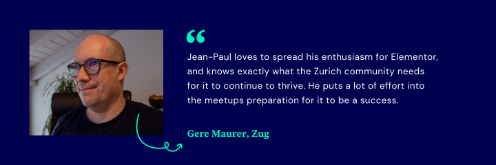 Jean-Paul a cherché à s'inscrire immédiatement à l'un de nos meetups pour approfondir ses connaissances et rencontrer des professionnels partageant les mêmes idées. Malheureusement, il n'y avait pas de communauté Elementor locale, et donc Jean-Paul, étant l'individu motivé qu'il est, a décidé d'établir la communauté officielle de Zurich en mai 2019.