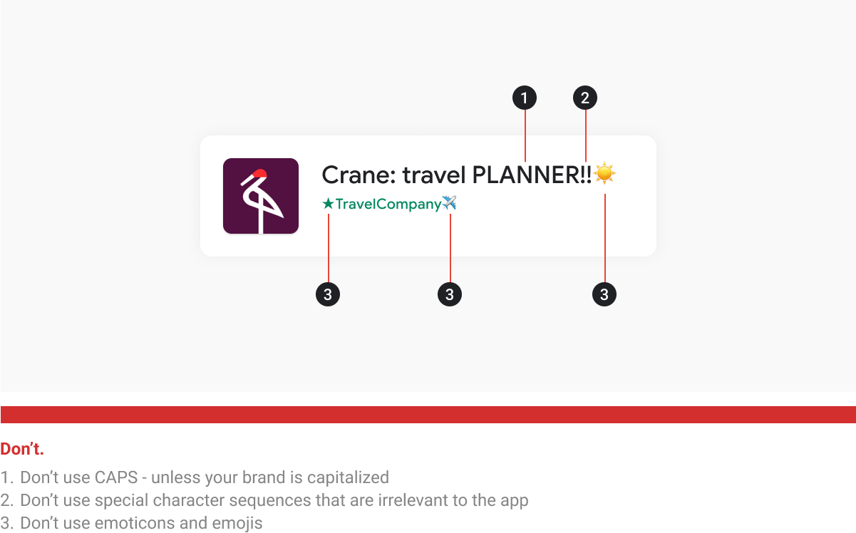 - Interdire les mots-clés qui impliquent les performances du magasin, la promotion dans l'icône, le titre et le nom du développeur