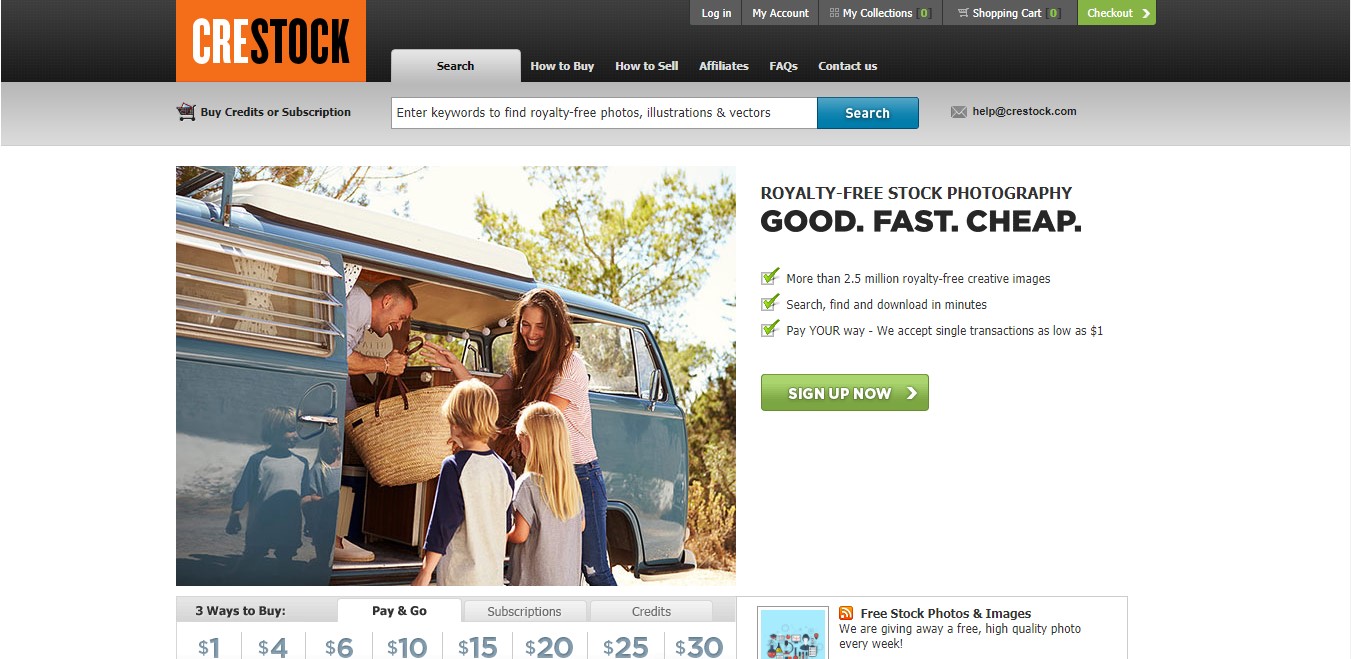 Tienes dos opciones si quieres adquirir material de Crestock: la suscripcion o los creditos. La primera te brinda 20 images diarias en cualquier resolucion con precios que arrancan en US$199 y con un maximum de 600 imagesnes. Tanto que si prefieres trabajar en el formato de creditos, cada uno equivale a US$1. Puedes comprar 10, 25, 50, 100, 250, 500 y 1000 creditos y descargarte hasta un maximum de 1000 imagesnes.