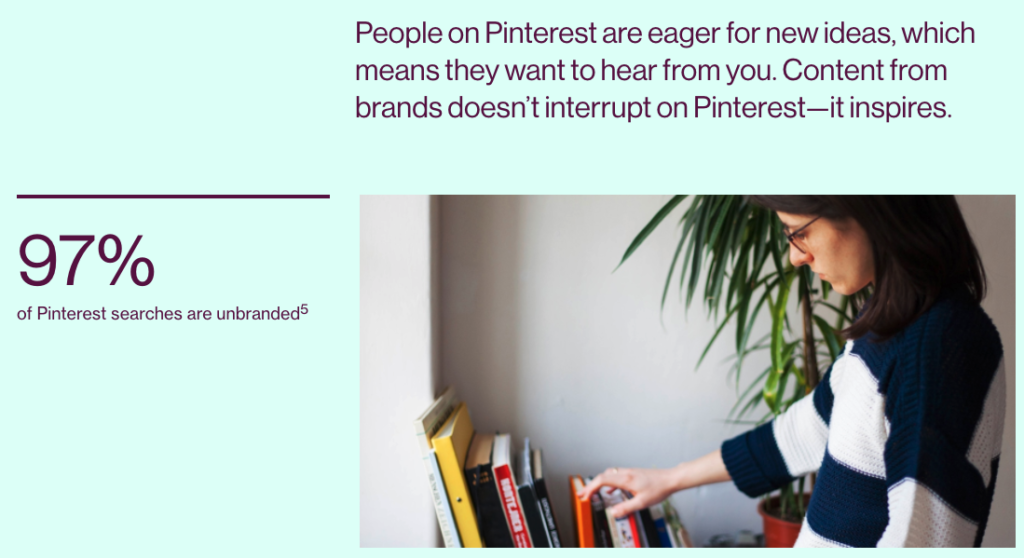 De plus, environ 2 milliards de recherches ont lieu sur Pinterest chaque mois, 97 % d'entre elles sont sans marque. Cela implique que les utilisateurs ne recherchent pas de marques spécifiques et sont ouverts à de nouvelles suggestions - et à de nouvelles entreprises avec lesquelles interagir !