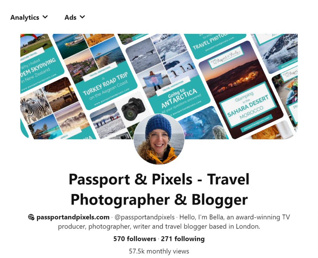 Votre photo de profil sur Pinterest doit refléter votre entreprise de photographie, de sorte que les photos personnelles ou de mauvaise qualité ne fonctionneront pas aussi bien ici.