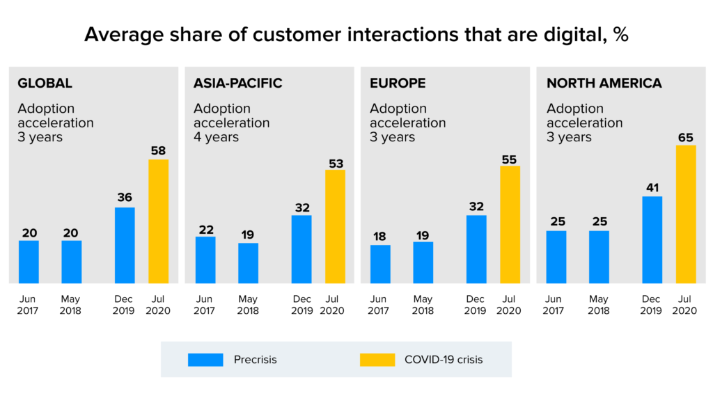 La pandémie a accéléré la digitalisation des entreprises . De nombreuses entreprises ont accéléré le processus de numérisation de leur chaîne d'approvisionnement, des interactions avec les clients et des opérations internes de trois à quatre ans. Non seulement cela, les entreprises ont également accéléré l'ajout de produits numériques et efficaces dans leurs portefeuilles de sept ans !