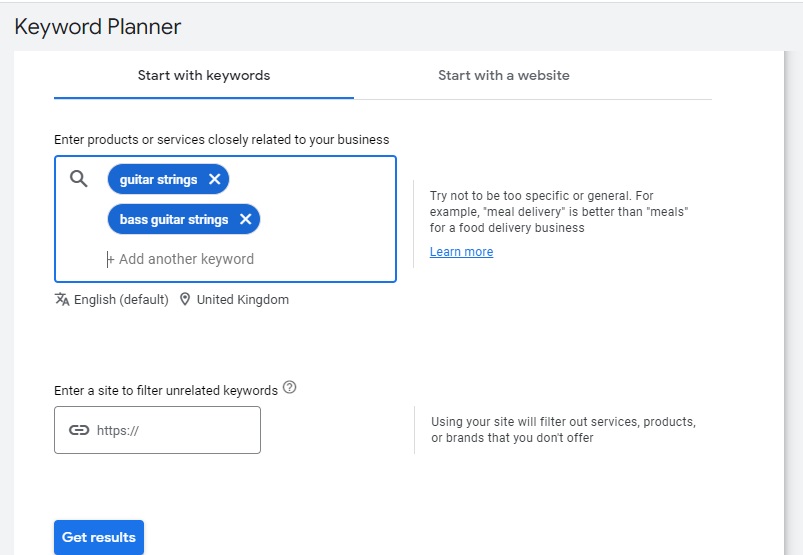 Depuis votre compte Google Ads, accédez à Keyword Planner >Découvrir de nouveaux mots clés et saisissez des mots clés liés aux produits que vous souhaitez promouvoir, tels que « cordes de guitare » pour un magasin d'instruments de musique ou « vêtements de course pour hommes » pour une entreprise de vêtements de sport :