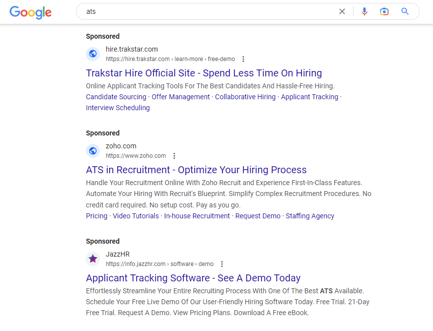 Disons que nous avons une société SaaS de système de suivi des candidats (ATS) qui souhaite percer dans les classements de recherche Google avec une campagne de recherche payante. Au début de la campagne publicitaire, il vous faudra probablement du temps pour découvrir la véritable intention de recherche du public à partir des données.