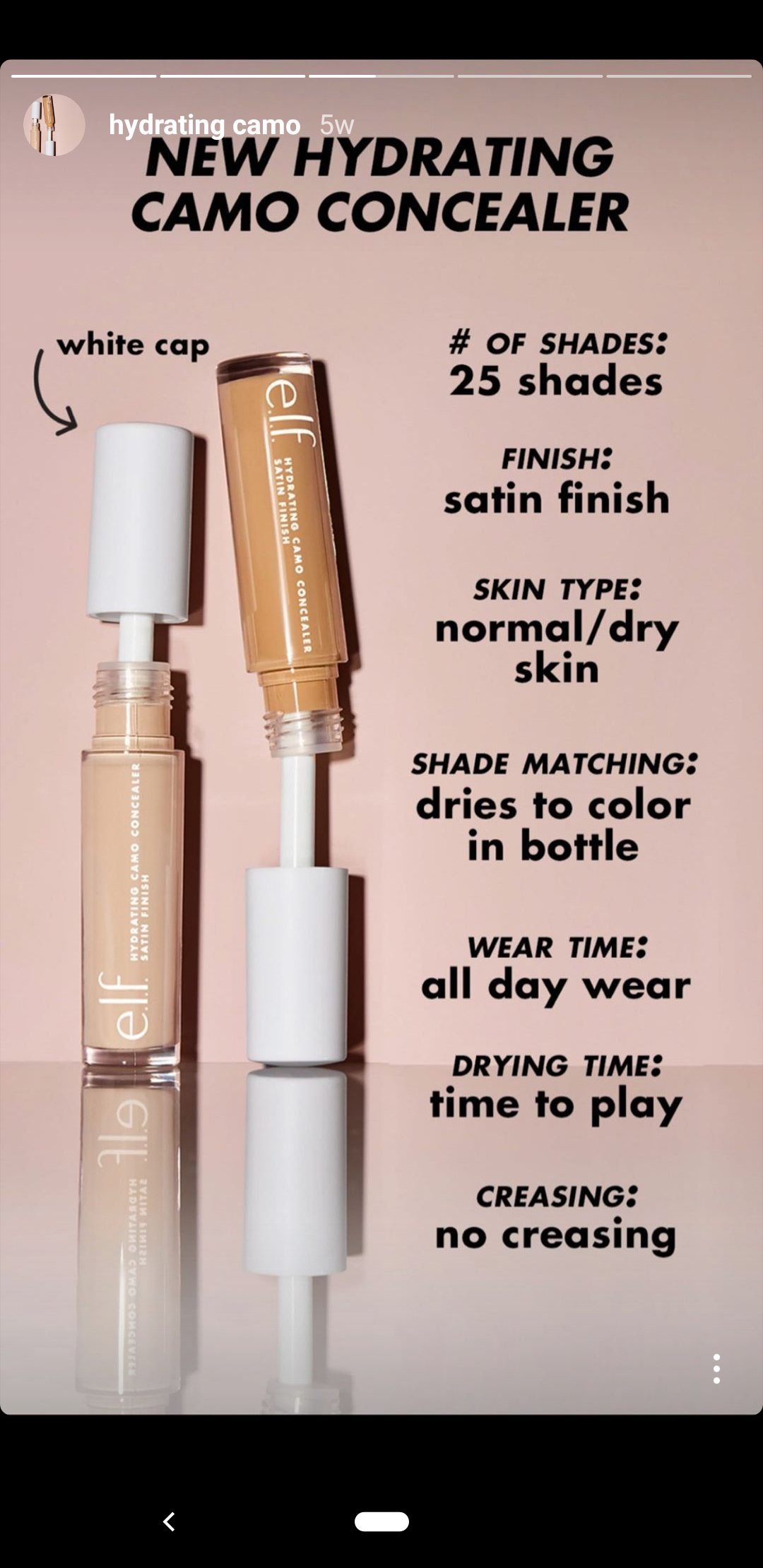 Le contenu éphémère et sensible au temps est "incontournable" mais naturel et est également un moyen d'apparaître dans le fil d'actualité et les notifications de vos abonnés s'ils dorment d'une manière ou d'une autre sur vos publications régulières. Par exemple, découvrez comment elf Cosmetics utilise Instagram Stories pour faire la promotion de sa dernière ligne.