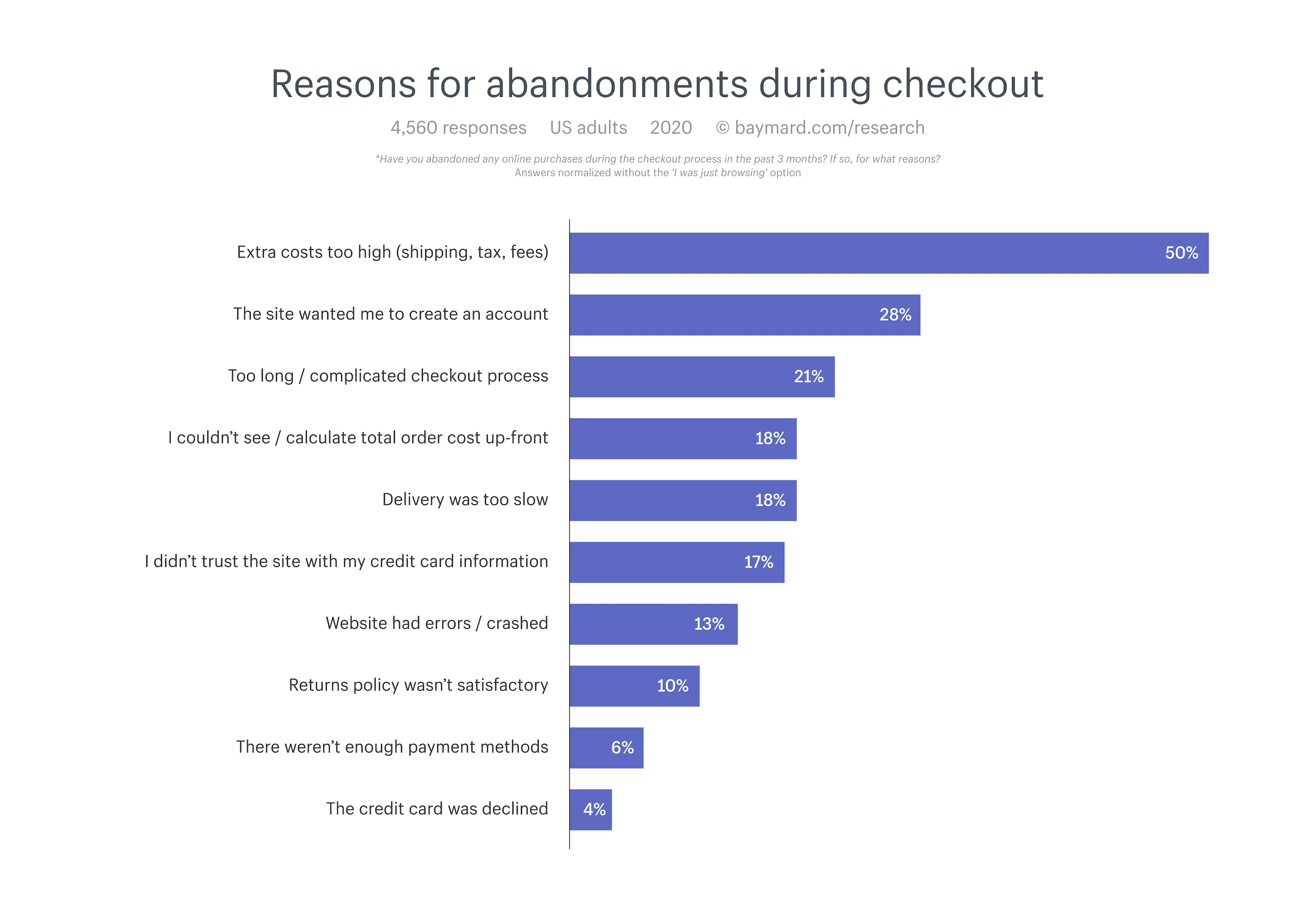 Le plus souvent, ils abandonnent leur chariot. La recherche fondamentale du Baymard Institute montre que les frais d'expédition inattendus sont la principale raison de l'abandon du panier d'achat.
