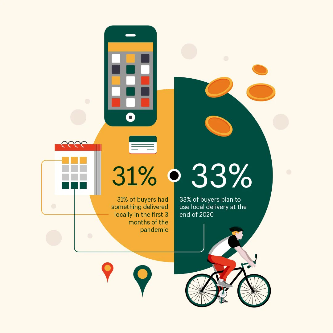 La livraison locale est un autre moyen d'acheminer directement les commandes aux clients à proximité et d'éviter d'utiliser un transporteur tiers. Les réponses à notre enquête indiquent que 31 % des acheteurs ont utilisé la livraison locale au cours des trois premiers mois de la pandémie , et cette tendance ne se ralentit pas de si tôt.