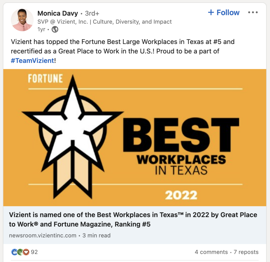 Vizient, la plus grande organisation américaine d'amélioration des performances des soins de santé, a créé un centre de ressources de plaidoyer avec Sprout. Il contient des démonstrations de produits, des vidéos pédagogiques et des webinaires à la demande, permettant aux employés de Vizient de devenir facilement des défenseurs de la marque sur les réseaux sociaux.