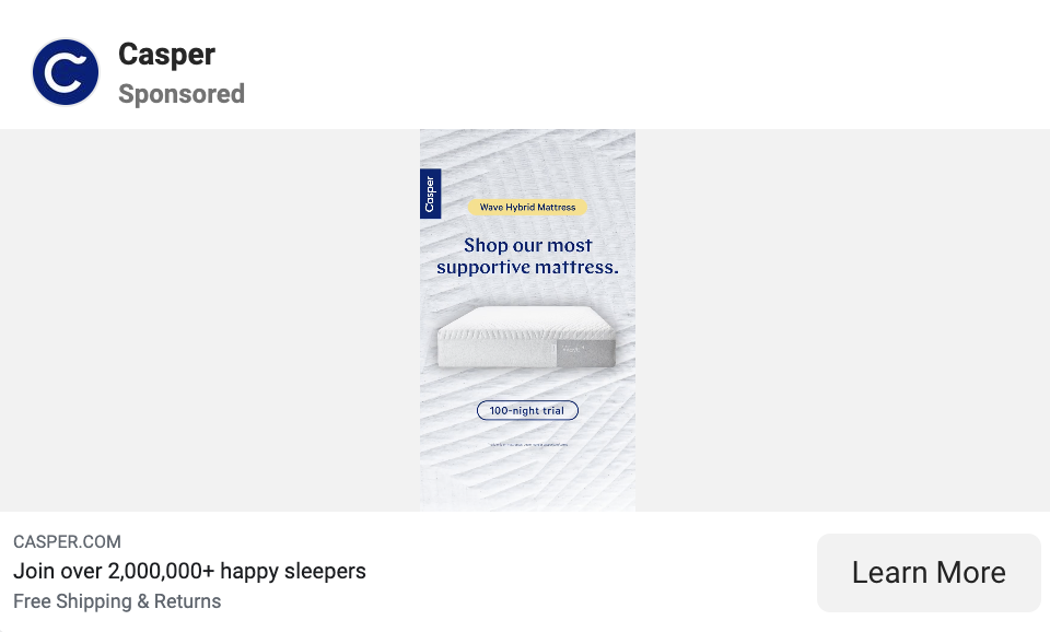 Casper utilise des publicités de reciblage pour réinciter ses précédents spectateurs à acheter leurs produits. Ces publicités de produits dynamiques sont personnalisées en fonction de l'activité de l'utilisateur sur son site Web et de ses préférences et incluent une preuve sociale (par exemple, « 2 000 000+ de dormeurs heureux ») pour renforcer la confiance.