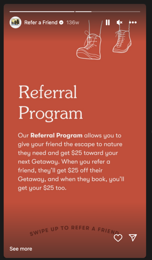 Par exemple, la marque de location de vacances Getaway dispose d'un programme de parrainage dans lequel les clients donnent et obtiennent 25 $ de réduction sur leur prochaine réservation lorsqu'ils parrainent un ami. La société propose un Instagram Highlight pour son programme de parrainage, afin que les utilisateurs aient toujours accès au contenu.
