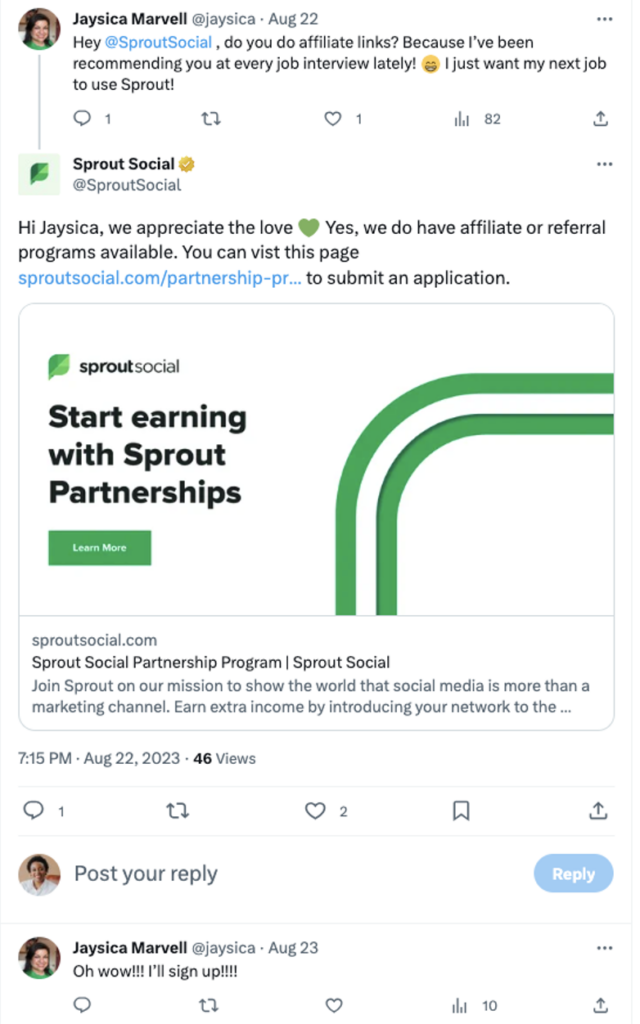 Découvrez comment l'équipe Sprout Social est intervenue lorsqu'un utilisateur de X a demandé si l'entreprise disposait d'un programme d'affiliation.