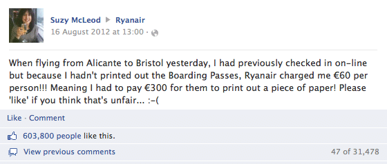 Par exemple, cette publication Facebook d'un client mécontent de Ryanair - qui a ensuite reçu plus de 600 000 likes et 30 000 commentaires dénigrant l'entreprise. Ouais.
