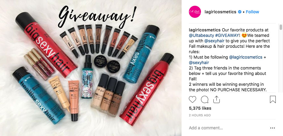 Partenariat avec d'autres entreprises complémentaires. Les bars et restaurants, les hôtels et les spas, ou même les salles de sport et les bars à jus ne sont que quelques exemples d'entreprises qui peuvent s'associer et faire de la promotion croisée. Les clients fidèles sont plus susceptibles de faire confiance à une recommandation pour une marque complémentaire. Par exemple, dans ce cadeau, les fidèles adeptes du détaillant de cosmétiques LA Girl Cosmetics seront probablement prêts à essayer les produits de Sexy Hair. Ce cadeau en partenariat permet de combler le fossé entre les différents publics.