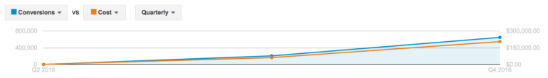J'ai continué à travailler ce que je savais être solide et à pousser les campagnes à la limite. L'année 2016 s'est terminée en décembre avec 83 486,92 $ de dépenses totales, dont 83 % dans AdWords. Alors que le volume de conversions diminuait d'un mois à l'autre (186 759 conversions au total en décembre), le potentiel de ce compte était évident et en moins d'un an, mon équipe et moi avons pu faire passer notre client d'une situation désespérée à un statut digne de champion.