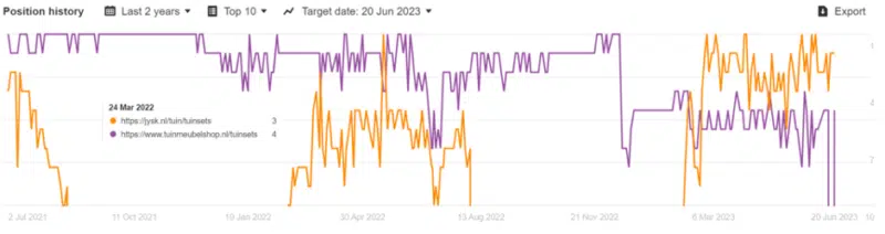 Encore une fois, en comparant le spécialiste du mobilier d'extérieur Tuinmeubelshop et la chaîne d'ameublement Jysk, la demande de la marque des spécialistes n'augmente « que » de 300 % tandis que celle de Jysks augmente de 717 %. Ce qui est plus extrême, c'est que sur la requête "loungeset". Jysk n'a jamais occupé le top 10 pendant l'intersaison au cours des deux dernières années. Mais pendant la haute saison, lorsque la demande des marques atteint son maximum, ils exploitent même les trois premiers.