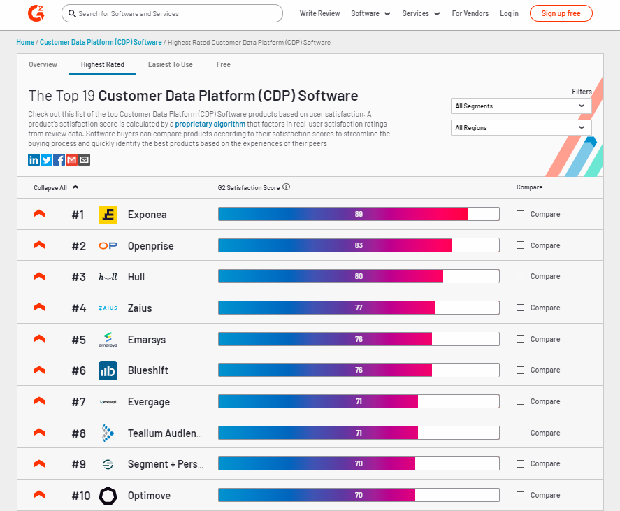 Selon G2, Exponea, Openprise et Hull sont actuellement les trois premiers CDP .