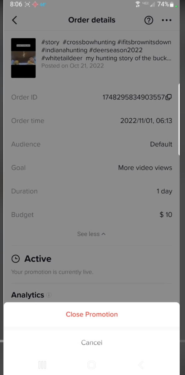 Annuler une promotion sur TikTok est simple. Accédez à votre vidéo sponsorisée, appuyez sur les trois points dans le coin supérieur droit et sélectionnez « Fermer la promotion ». Tous les fonds promotionnels inutilisés seront automatiquement remboursés sur votre solde Promote pour les promotions futures ou retirés de votre compte.