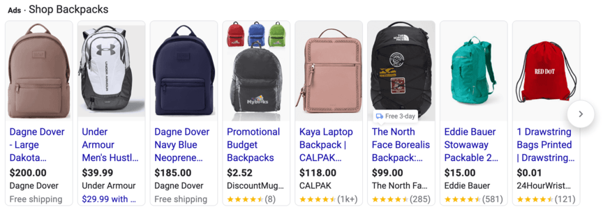 Alors que les annonces textuelles annoncent généralement des entreprises ou des services, les annonces carrousel annoncent des produits spécifiques. Une autre différence par rapport aux annonces textuelles est que les annonces textuelles ont une limite supérieure de quatre annonces en haut d'une page, tandis que les annonces carrousel peuvent apparaître par groupes de près de 20.