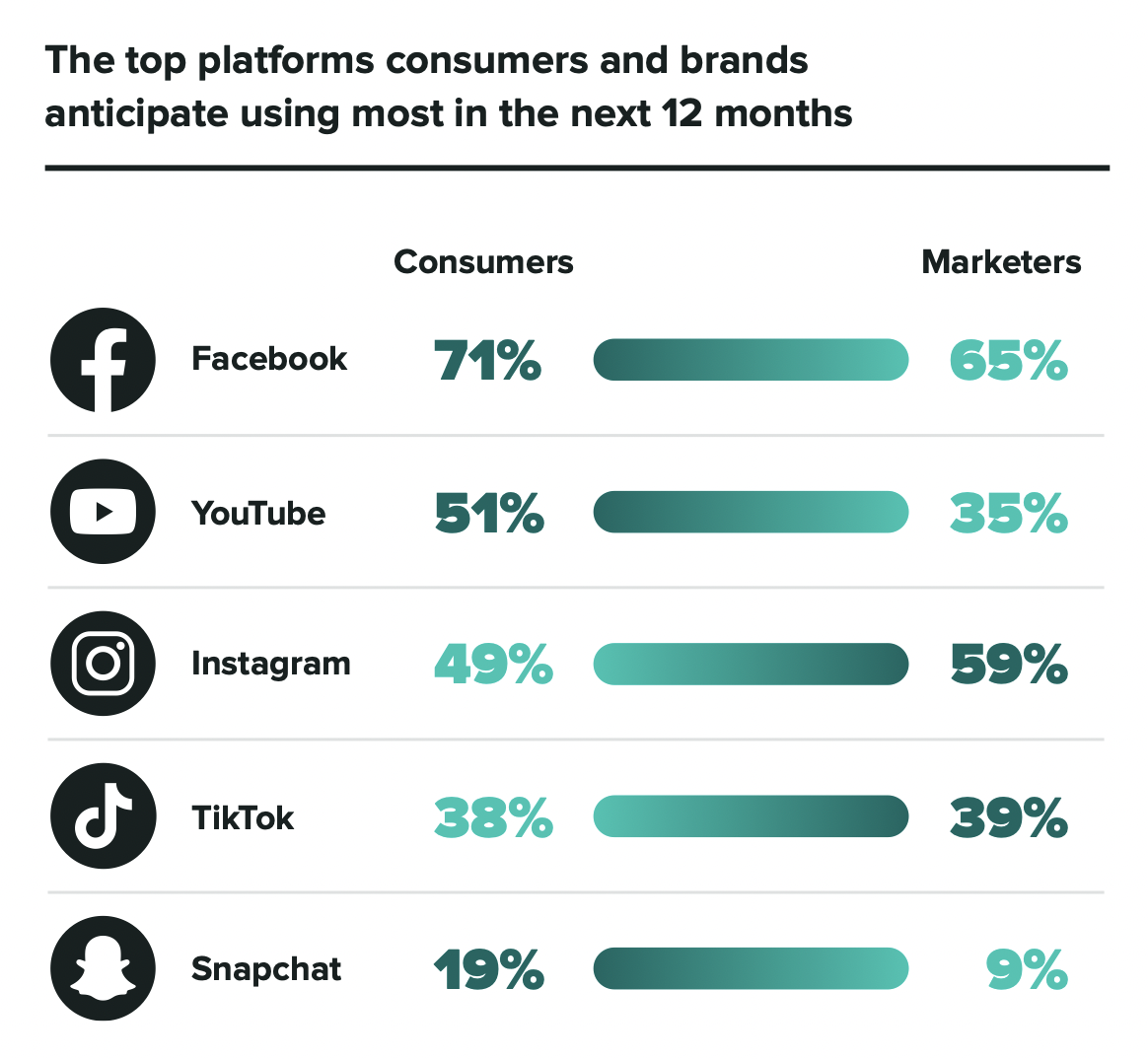 Si vous n'avez jamais utilisé de vidéo sur aucune plate-forme, commencez par celles où vous avez déjà établi des audiences. Selon le Sprout Social Index, Facebook, Youtube, Instagram, Snapchat et TikTok sont les principales plateformes que les consommateurs et les marques prévoient d'utiliser le plus au cours de la prochaine année.