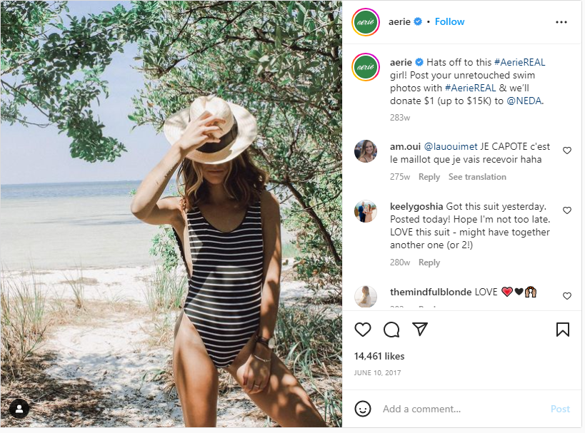 Aerie est un exemple de marque utilisant du contenu généré par les utilisateurs pour se connecter avec son public. La marque de vêtements pour femmes a demandé à ses clientes de partager des photos d'elles-mêmes portant leurs produits pour avoir une chance de figurer sur leur page Instagram.