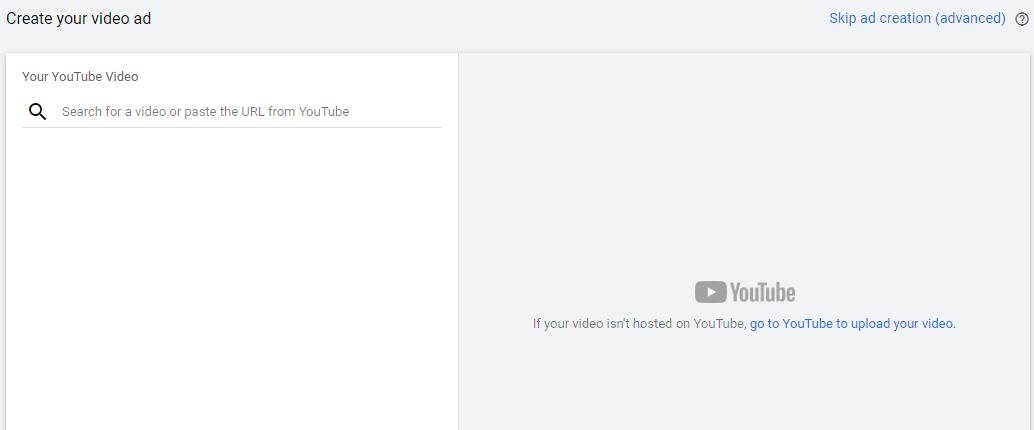 L'étape suivante consiste à choisir la vidéo que vous souhaitez utiliser comme annonce. Vous pouvez soit rechercher la vidéo à l'aide d'un mot-clé, soit coller l'URL de la vidéo. Dans le volet de droite, vous aurez la possibilité de télécharger votre vidéo si vous ne l'avez pas encore sur YouTube. Mais n'oubliez pas que nous avons déjà mis en ligne une annonce vidéo à l'étape 1, alors recherchez ou collez l'URL de cette vidéo ici.