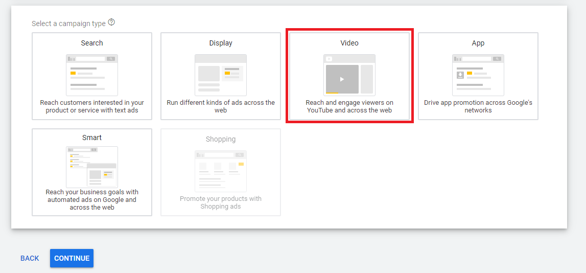 Dans la liste des types de campagne, sélectionnez "Vidéo" et cliquez sur "Continuer".