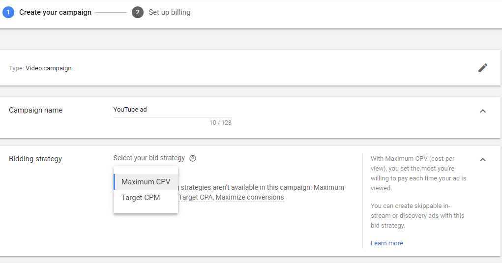 L'étape suivante consiste à personnaliser votre campagne en lui donnant un nom, en définissant votre budget, en choisissant vos réseaux et plus encore. Commencez par nommer votre campagne sous "Nom de la campagne", puis sélectionnez votre stratégie d'enchères.