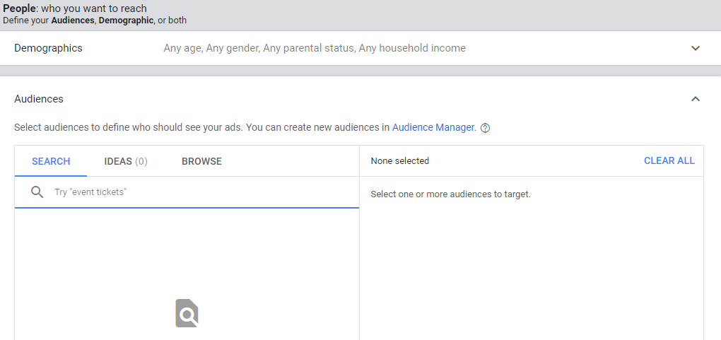 Cette prochaine étape est cruciale car elle déterminera l'efficacité de votre campagne publicitaire YouTube et le retour sur vos dépenses publicitaires. Sélectionnez le groupe démographique que vous souhaitez cibler et les publics auxquels vous souhaitez afficher votre annonce. Ici, vous aurez également la possibilité de créer une audience personnalisée, alors assurez-vous de tester cette option si vous n'avez pas encore d'audience personnalisée en place.
