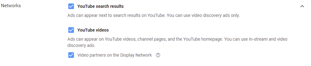 Vous avez également la possibilité de choisir les réseaux sur lesquels vous souhaitez diffuser votre annonce. Lors de la création d'une annonce vidéo, vous avez trois options : les résultats de recherche YouTube, les vidéos YouTube et les partenaires vidéo sur le Réseau Display. Et vous pouvez choisir plus d'une option.