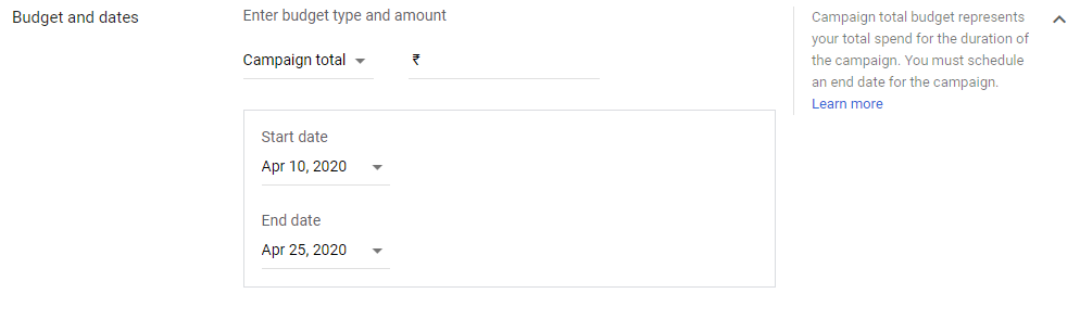Définissez ensuite un budget pour votre campagne. Combien êtes-vous prêt à dépenser pour cela ? Si vous débutez, vous voudrez peut-être expérimenter avec un petit budget et voir comment cela se passe. Ensuite, sélectionnez la période de votre campagne.