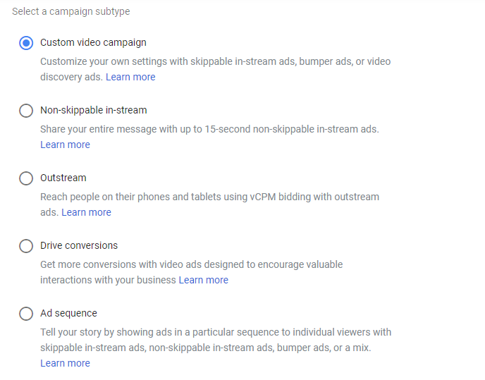 Cela vous donnera alors la possibilité de sélectionner votre sous-type de campagne. Il est préférable de choisir "Campagne vidéo personnalisée" afin de mieux la personnaliser selon vos besoins.