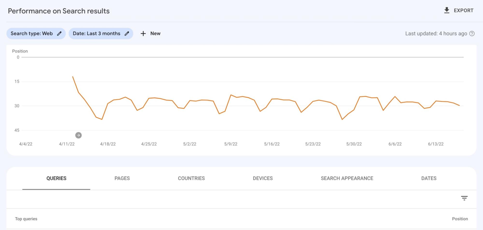 Posisi rata-rata membantu Anda dengan cepat mengidentifikasi apakah halaman web Anda membaik atau tidak. Sekali lagi, dengan menggunakan diagram garis, Anda juga dapat memantau tren, musim, dan kemungkinan efek pembaruan algoritme Google.