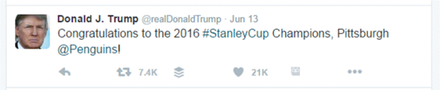 Pengikut juga menghargai melihat sisi kemanusiaan politisi. Dari waktu ke waktu Trump juga men-tweet hal-hal non-politik, seperti memberi selamat kepada Penguin atas kemenangan Piala Stanley mereka.