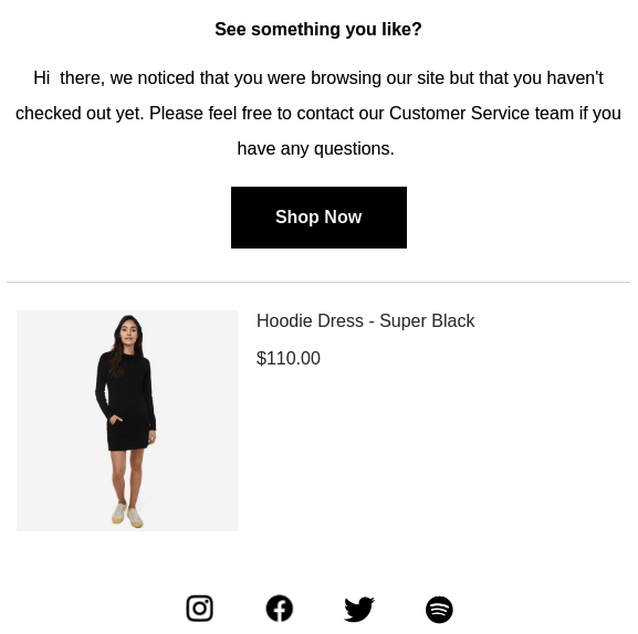 Merek ini dapat bekerja untuk mengidentifikasi alasan pengabaian keranjang, kemudian memberikan solusi dalam email. Ya, itu memang menawarkan layanan pelanggan sebagai opsi, tetapi itu meleset dari sasaran di email ini.