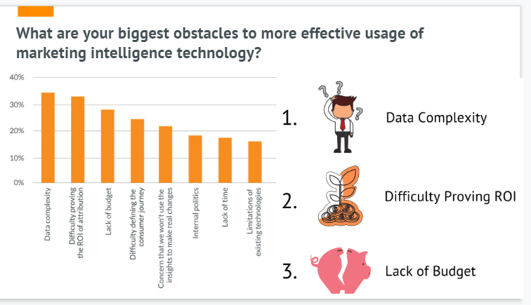Tidak mengherankan, kendala terbesar yang disebutkan adalah kompleksitas data, kesulitan membuktikan ROI, dan kurangnya anggaran.