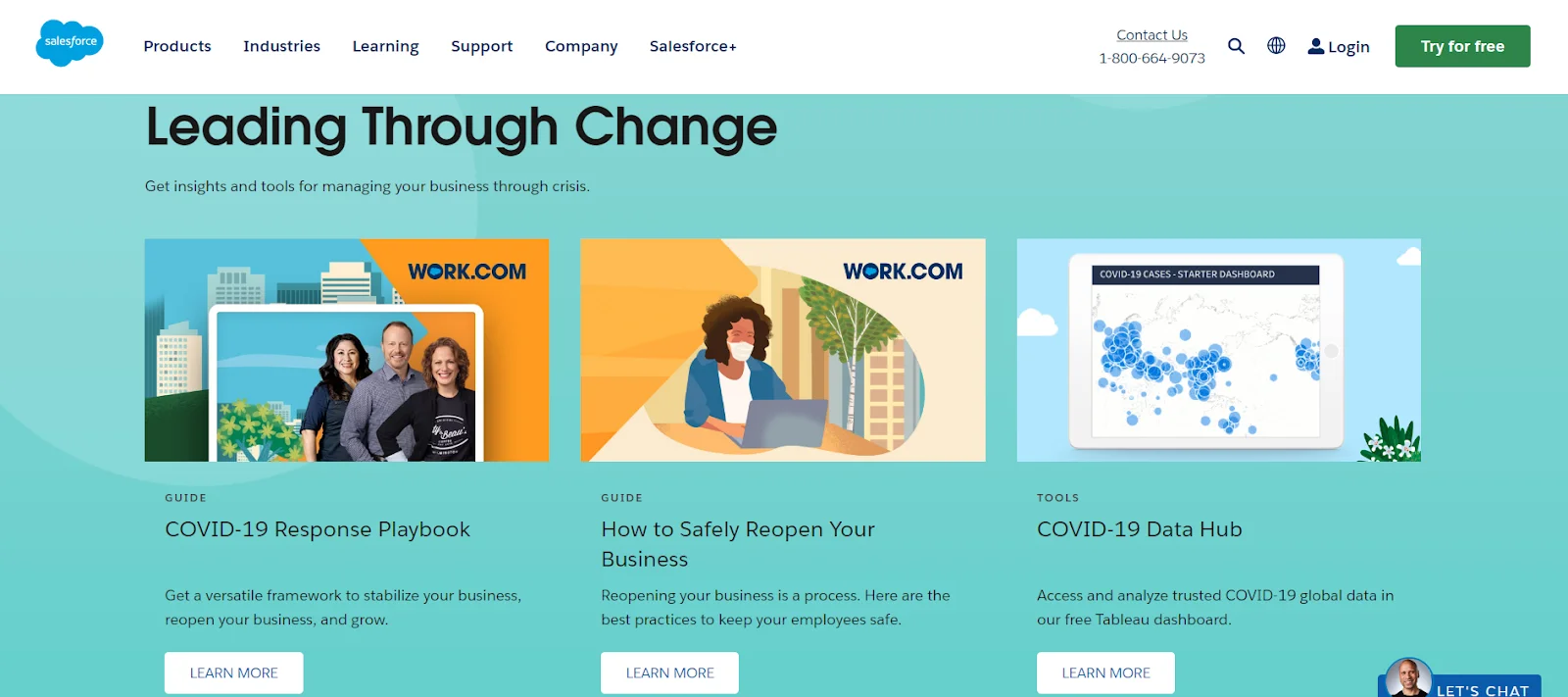Butuh inspirasi? Salah satu perusahaan perangkat lunak berbasis cloud terbesar, Salesforce, membangun pusat sumber daya 'Memimpin Melalui Perubahan', menampilkan blog, webinar, video, dan ebook untuk membantu bisnis mengatasi krisis ekonomi akibat pandemi pada tahun 2020-21. HubSpot juga menempuh rute yang sama dengan meluncurkan Adapt 2020 untuk membantu bisnis beradaptasi dengan lingkungan yang berubah melalui konten pendidikan.