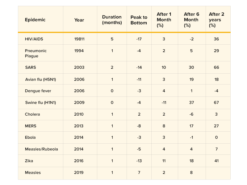 Pada bulan Maret, pasar saham berbagi kerugian terbesar mereka sejak resesi 2008, mengisyaratkan perlambatan global . Menyusul deklarasi WHO tentang Coronavirus sebagai pandemi , Dow juga memasuki wilayah pasar bearish dan analisis dampak virus corona di seluruh industri dimulai. Kemudian hanya butuh sedikit waktu bagi para manajer kekayaan untuk menarik kesejajaran antara perlambatan ekonomi dunianya pada tahun 2019 dan yang diciptakan oleh pandemi di masa lalu.
